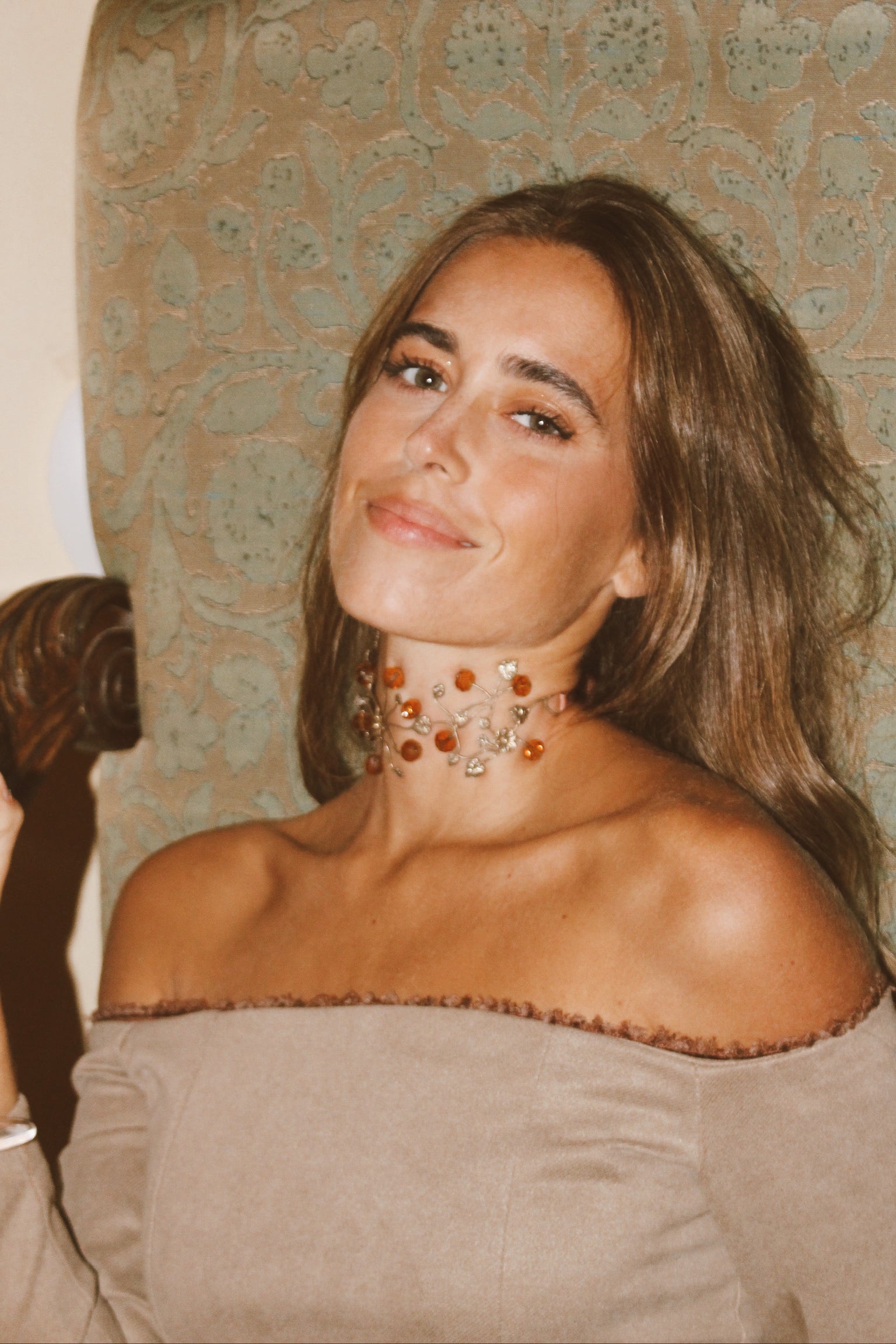 Choker dorado con bolas de cristal facetadas en marrón. Ajustable.